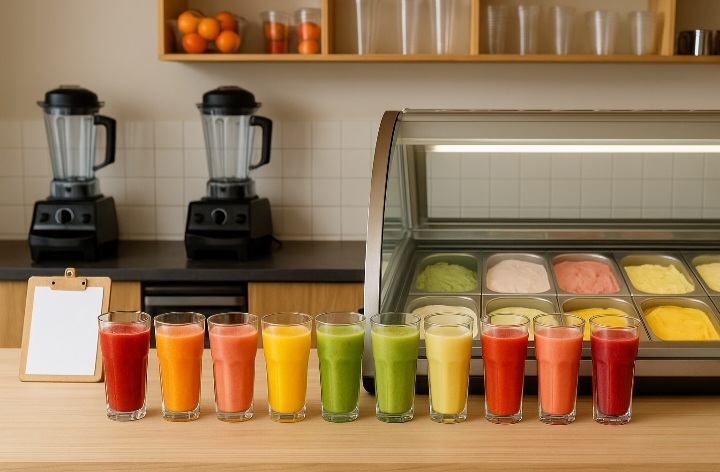اختيار نوع المنتجات (عصائر طبيعية، مثلجات فواكه، كوكتيلات صحية…) بناءً على تفضيلات السوق.